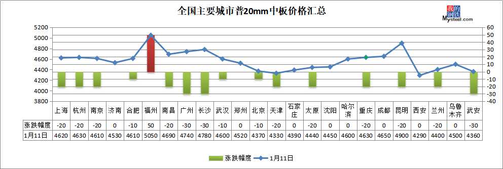 中厚板:1月11日,全國24個主要城市20mm普板均4570元/噸,較上個交易日下跌11元/噸。今日期貨走勢弱勢震蕩運行,商家心態謹慎觀望,早盤報價稍有下調。成交方面,今日市場整體成交較上周五偏弱,部分貿易商為保證出貨量,暗降10-20元/噸走貨。據了解,近期部分地區鋼廠已經開始檢修,預計本月市場到貨量一般,短期仍對價格稍有利好作用。綜合來看,目前市場價格基本已被下游接受,在供需弱平衡的情況下,價格波動幅度有限,預計明日國內中厚板價格盤整運行。
