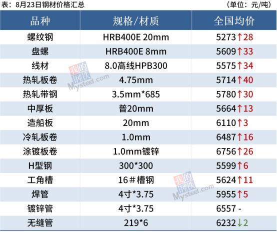 中厚板:8月23日,全國24個主要城市20mm普板均價5664元/噸,較上個交易日價格上漲13元/噸。供應層面看,近期鋼廠檢修、復產頻率依舊較高,產量處于略微偏低水平,但是隨著鋼廠利潤的擴張,部分鋼廠有推遲檢修計劃,未來中板產量降幅或有限。流通環節看,由于前段時間北方鋼廠一單一議價格較高,且南北價差收窄,訂貨需求顯著下滑,導致近期市場到貨量有所下降,社庫增幅較小,緩解累庫壓力。需求方面,隨著這輪中板價格的深度調整,投機需求下降,下游采購節奏放緩,部分需求被抑制,但從上周五市場情況看,現貨企穩后,需求在本周將有一定程度放量。綜合預計,24日中厚板價格小幅上漲為主。