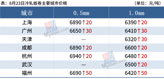 冷軋板卷:8月23日,全國24個主要城市1.0mm冷卷均價6487元/噸,較上個交易日上漲16元/噸。今日期貨震蕩趨強運行以及近期鋼廠結算相對偏高刺激,多地商戶多挺價出售為主;南北價差呈持續收窄狀態,加之需求整體仍未釋放,整體成交偏弱。下游方面,近期下游接單情況一般,設備未全面開工,原材料多按需采購,資金面壓力尚存。預計24日國內冷軋現貨價格多窄幅震蕩運行。