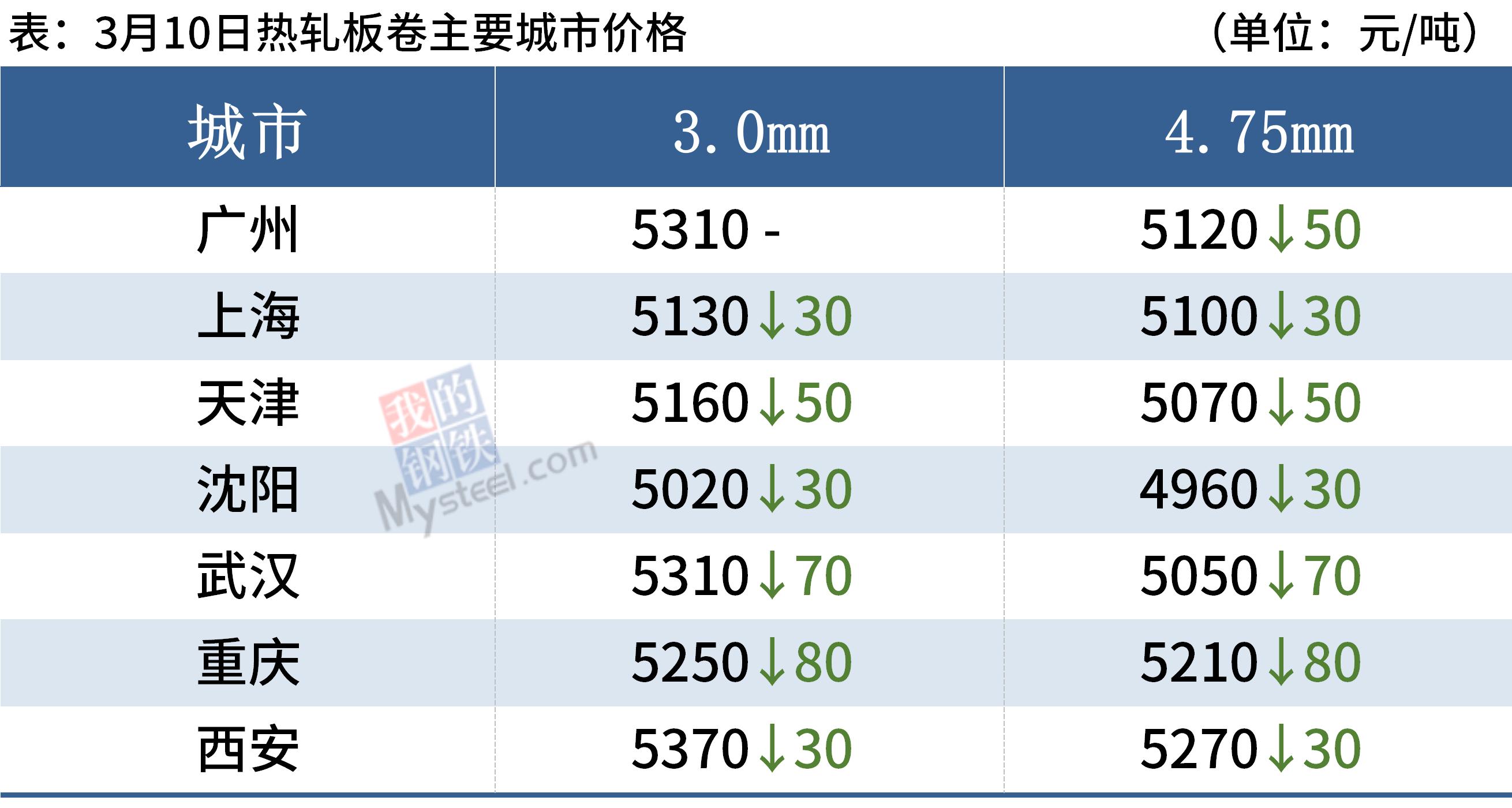 中厚板:3月10日,全國24個主要城市20mm普板均價5250元/噸,較上個交易日下跌33元/噸。據Mysteel周度鋼材產量、庫存數據顯示,本周中板產量減4.06萬噸,廠庫降2.70萬噸,社庫降4.66萬噸,產量庫存雙減,鋼廠受原料漲價及兩會影響,一定程度減量,貿易商投機性需求較少,備貨水平整體有所下降,需求方面小幅回升,程度有限。綜合預計,11日國內中厚板價格震蕩調整為主。