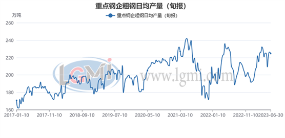 據中國鋼鐵工業協會統計數據顯示,2023年6月下旬重點鋼企生鐵日均產量202.87萬噸,旬環比上升0.52%,同比上升4.59%;6月下旬重點鋼企粗鋼日均產量224.6萬噸,旬環比下降0.74%,同比上升7.0%;6月下旬重點鋼企鋼材日均產量230.65萬噸,旬環比上升6.41%,同比上升6.9%。