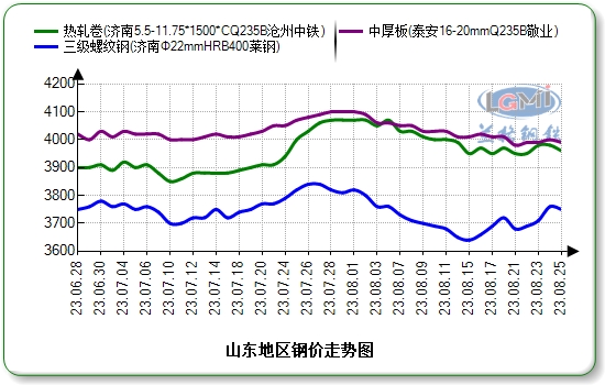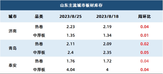 本周山東區域庫存情況表現不一,建材庫存小幅下降,板材區域窄幅增加。具體來看截止到8月26日,建材方面,濟南螺紋庫存總量10.42萬噸,較上周下降0.55萬噸;青島螺紋庫存9.02萬噸,較上周下降0.58萬噸;泰安螺紋庫存2.45萬噸,較上周微降0.1萬噸。
