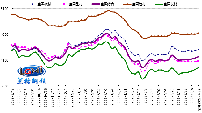 2023年第37周(2023.9.11-9.15)蘭格鋼鐵全國(guó)絕對(duì)價(jià)格指數(shù)為4145元,較上周上升0.7%,較去年同期下降3.9%。其中,蘭格鋼鐵長(zhǎng)材絕對(duì)價(jià)格指數(shù)為3926元,較上周上升1.3%,較去年同期下降6.3%;蘭格鋼鐵型材絕對(duì)價(jià)格指數(shù)為4074元,與上周持平,較去年同期下降6.4%;蘭格鋼鐵板材絕對(duì)價(jià)格指數(shù)為4285元,較上周上升0.5%,較去年同期下降0.7%;蘭格鋼鐵管材絕對(duì)價(jià)格指數(shù)為4604元,較上周下降0.1%,較去年同期下降6.4%。