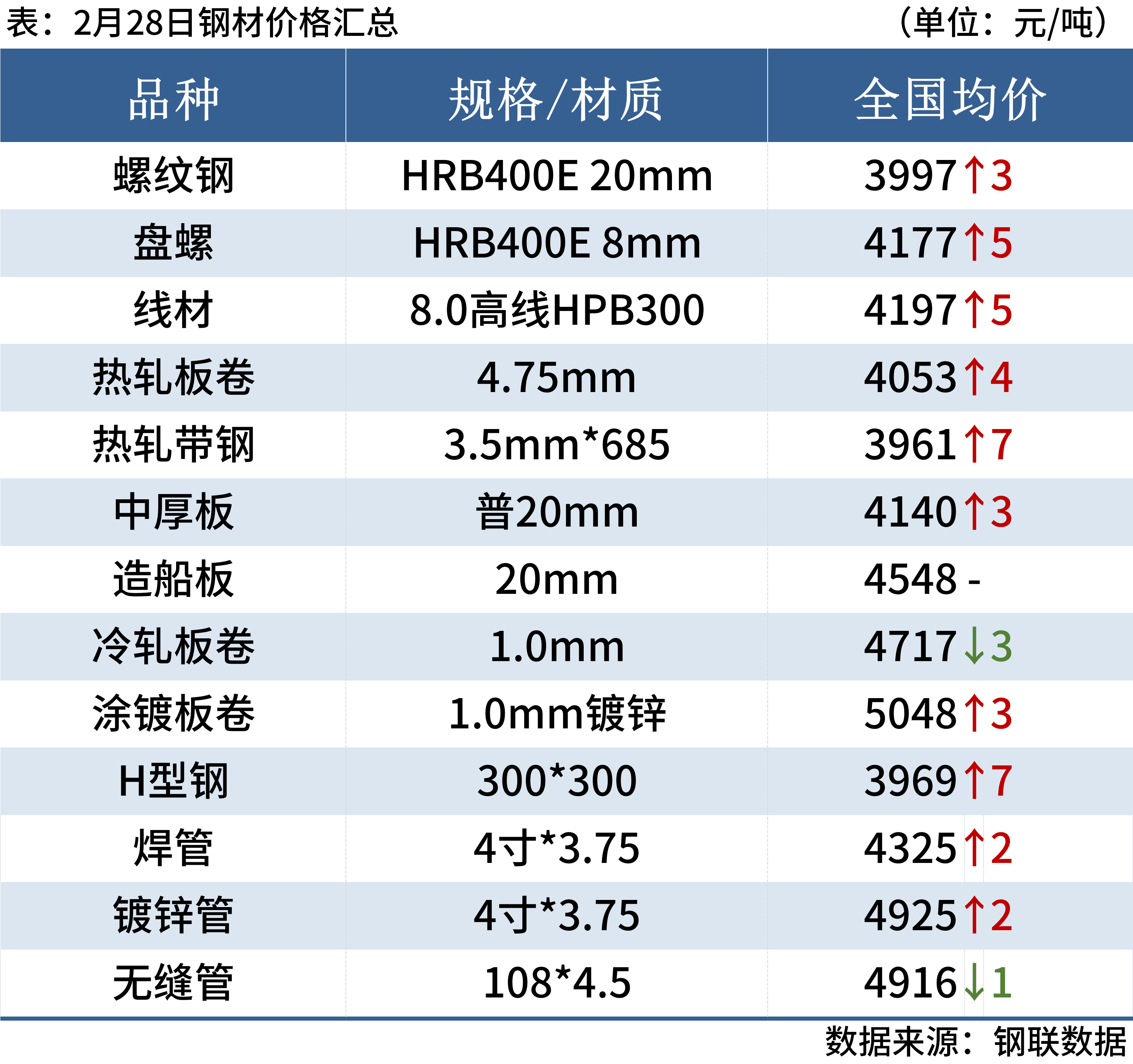 螺紋鋼:2月28日,全國(guó)31個(gè)主要城市20mm三級(jí)抗震螺紋鋼均價(jià)3997元/噸,較上個(gè)交易日漲3元/噸。短期來(lái)看,目前電爐復(fù)產(chǎn)在即,但部分高爐有減產(chǎn)情況,產(chǎn)量維持低位;節(jié)后需求整體恢復(fù)并不樂(lè)觀,尤其是新開(kāi)工及復(fù)工數(shù)據(jù)偏差。同時(shí)焦炭提降等原料下跌,成本支撐不足。因此從基本面來(lái)看,市場(chǎng)仍然處于偏弱格局。需關(guān)注宏觀方面的利好預(yù)期,對(duì)市場(chǎng)信心或有一定提振,預(yù)計(jì)29日國(guó)內(nèi)建筑鋼材市場(chǎng)價(jià)格或?qū)⒗^續(xù)震蕩為主。