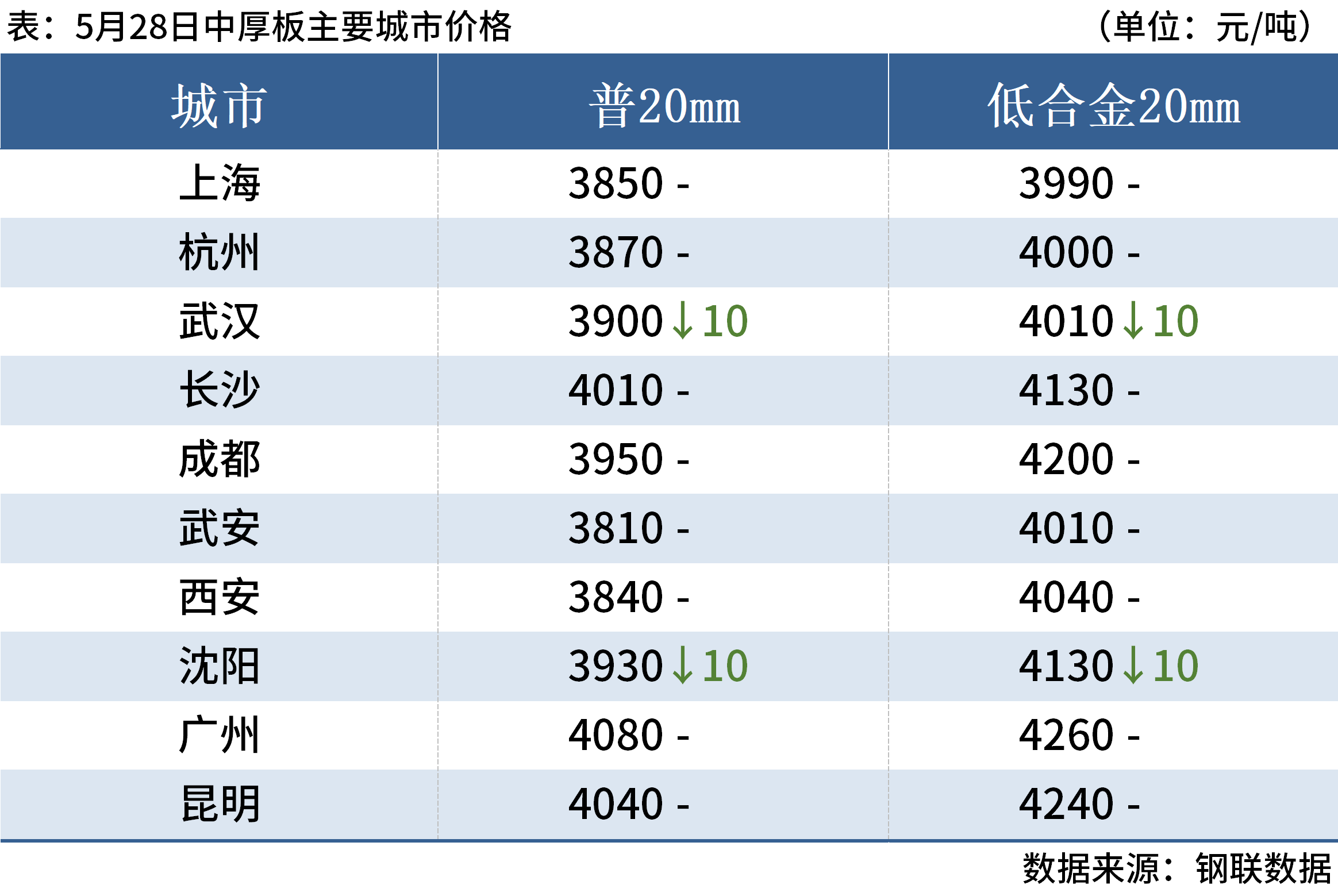 中厚板:5月28日,全國24個主要城市20mm普板均價3927元/噸,較上個交易日持平。期貨盤面午后震蕩趨弱運行,市場交投氛圍偏冷清,整體成交一般。據市場反饋,原料方面來看,焦炭發起提漲,鐵礦石價格震蕩運行,成本支撐尚可,鋼廠生產積極性一般。市場方面來看,對高價資源接受程度有限,低價按需采購為主,整體成交量較昨日有所下降。現階段貿易商操作偏謹慎,快進快出降庫為主,部分暗降出貨以促成交。綜合來看,預計29日國內中厚板價格窄幅震蕩運行。