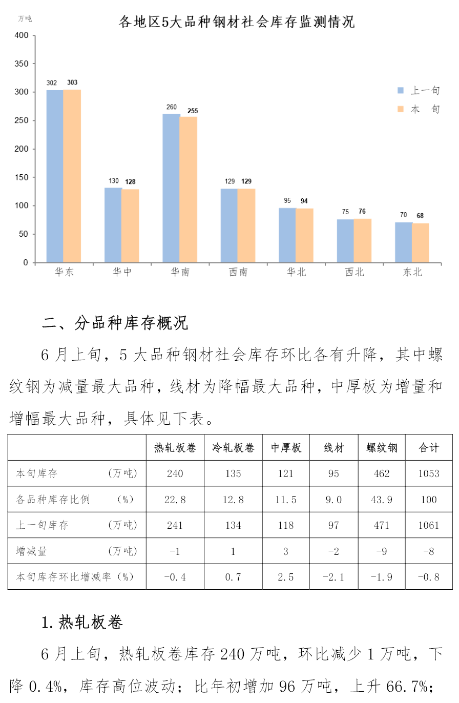 中鋼協:6月上旬鋼材社會庫存1053萬噸 環比下降0.8%