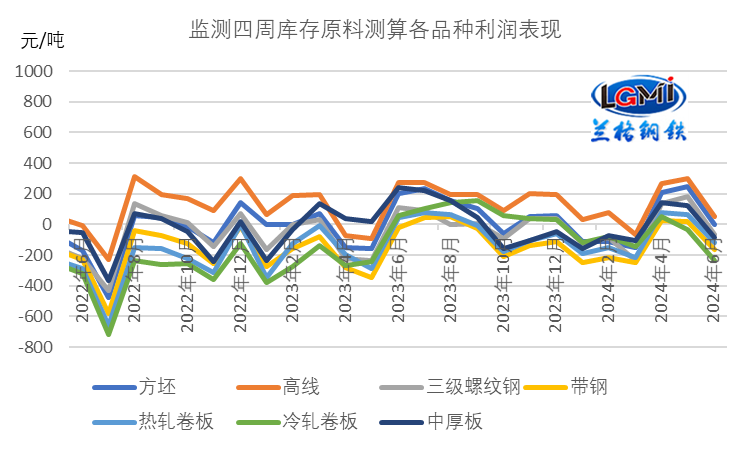以四周庫存原料測算各品種的毛利表現來看,6月份四周庫存原料測算品種月均毛利均呈現轉差態勢;蘭格鋼鐵研究中心監測數據顯示,監測的七大品種月均毛利轉差幅度在180-246元之間,僅有鋼坯和高線表現小幅盈利,其他品種均呈現虧損狀態。