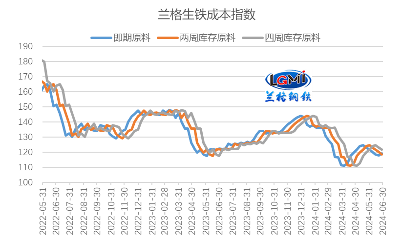 隨著原料價格波動,不同原料庫存周期成本差異明顯。為了便于客戶了解不同庫存周期的成本變化,蘭格鋼鐵研究中心對即期購買原料、兩周庫存原料、四周庫存原料的成本指數進行對比,如圖1所示。從圖可以看出,伴隨著主要原料價格的震蕩回落后企穩反彈,2024年6月份即期庫存原料測算成本呈現企穩態勢,而兩周庫存原料測算成本呈現逐步回落態勢,而四周庫存原料測算成本呈現見頂回落特征。