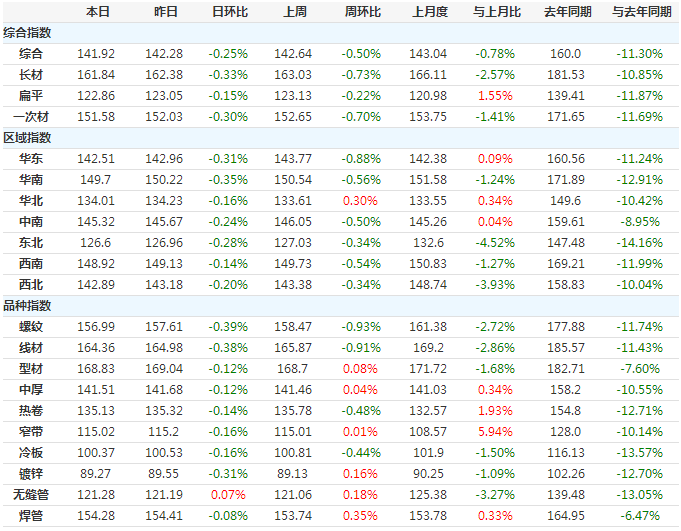 ?12月26日,國內鋼材指數(Myspic)綜合指數報141.92點(絕對價格指數3996),較上一交易日下跌0.25%。其中,螺紋鋼指數報156.99點(絕對價格指數3968),較上一交易日下跌0.39%;熱卷指數報135.13點(絕對價格指數3789),較上一交易日下跌0.14%。