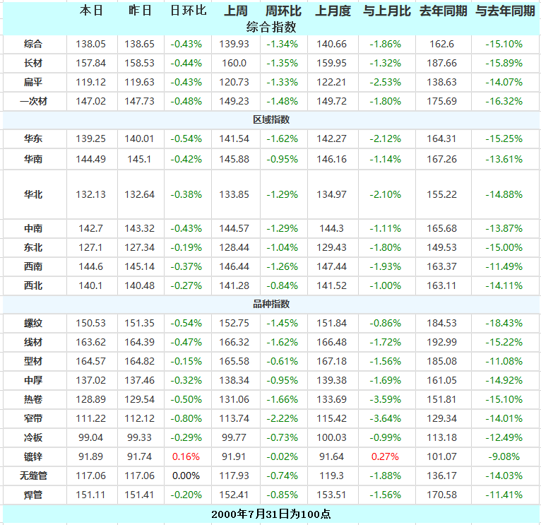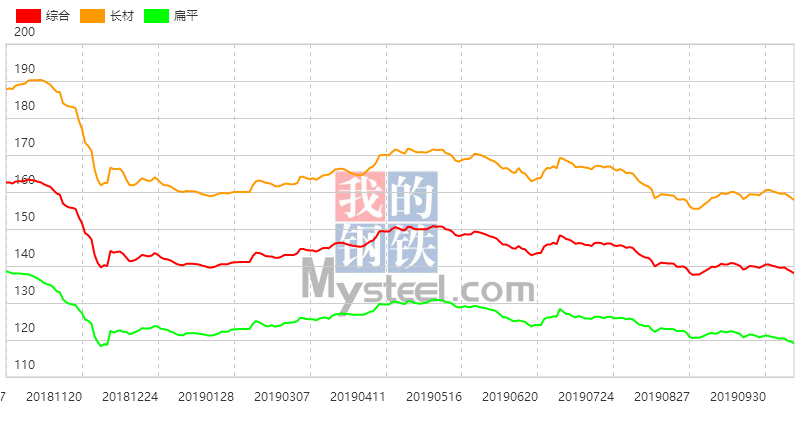 10月17日,國內鋼材指數(Myspic)綜合指數報138.05(絕對價格指數3894.6),較上一交易日下跌0.39%。其中,螺紋鋼指數報150.53(絕對價格指數3805.1),較上一交易日下跌0.33%;熱卷指數報128.89(絕對價格指數3613.8),較上一交易日下跌0.50%。