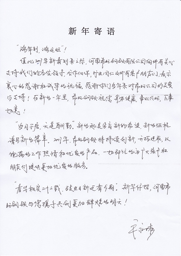 您好!感謝您一直以來對希旺鋼鐵的鼎力支持,在2017年農歷新年到來之前,在此先預祝大家新春愉快!衷心祝愿大家過個歡樂、祥和的春節,雞年吉祥!希旺鋼鐵祝您新的一年萬事如意!